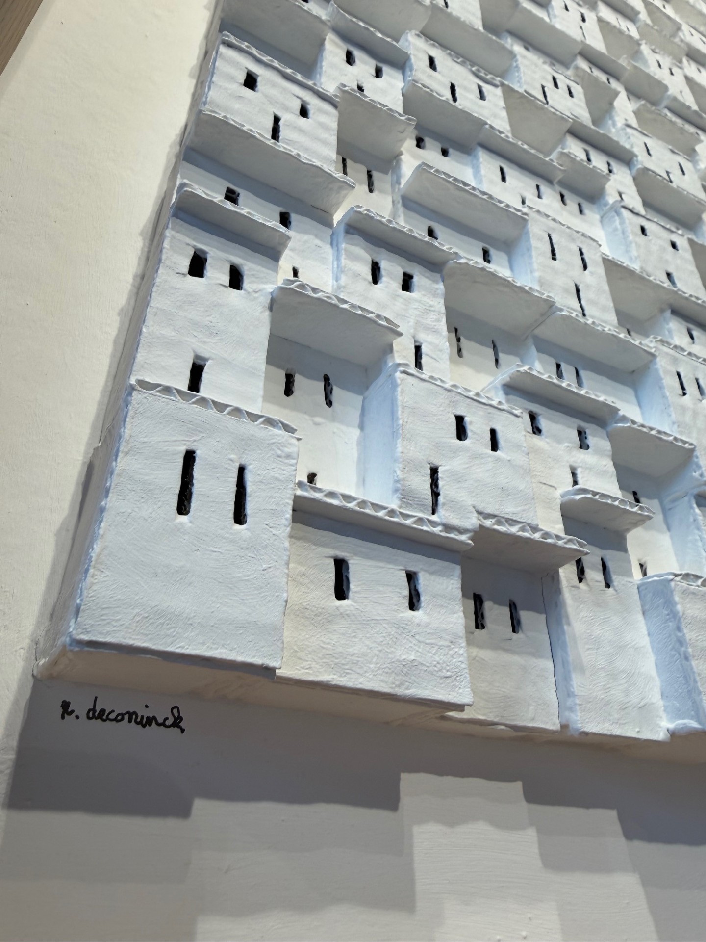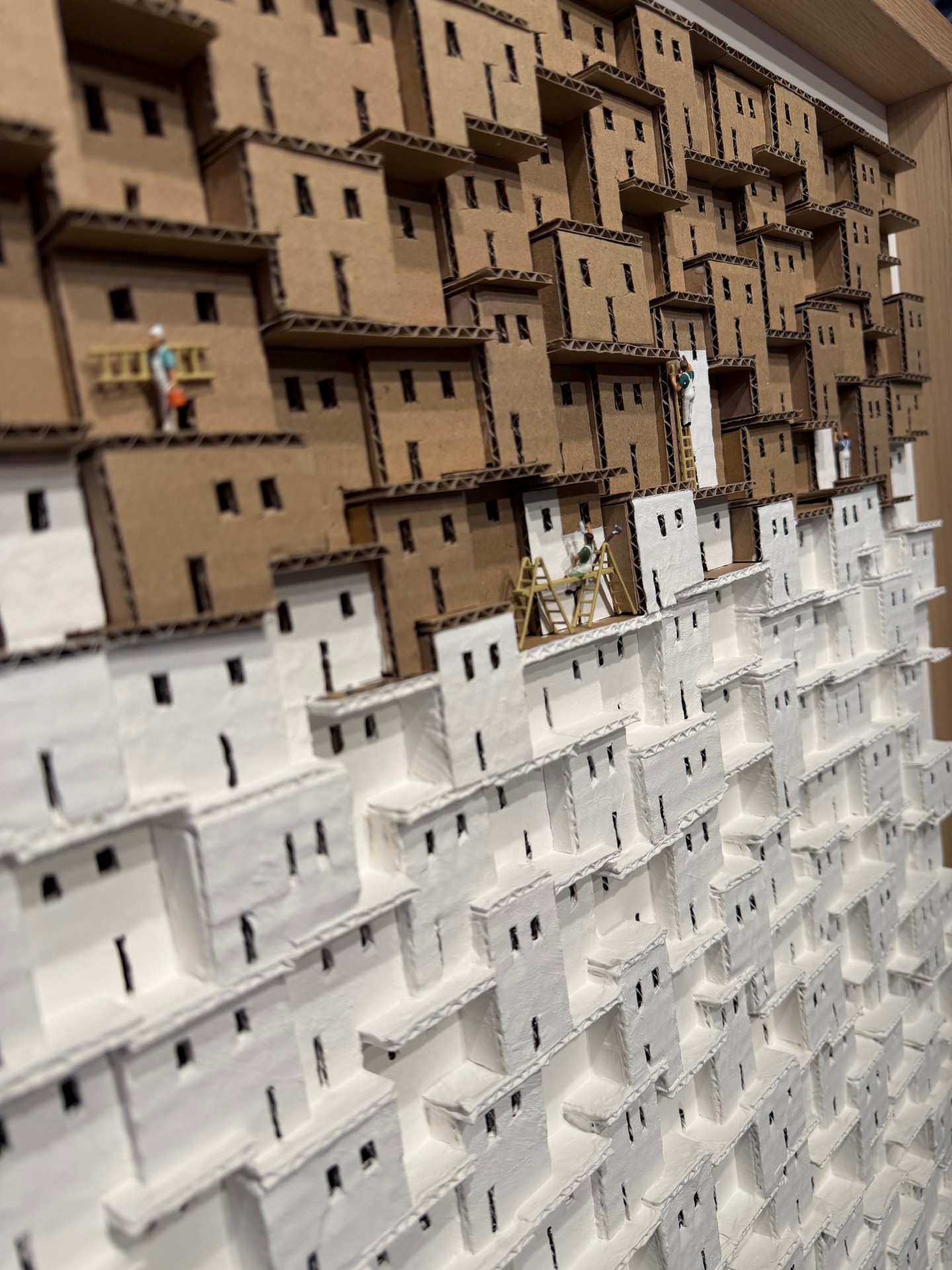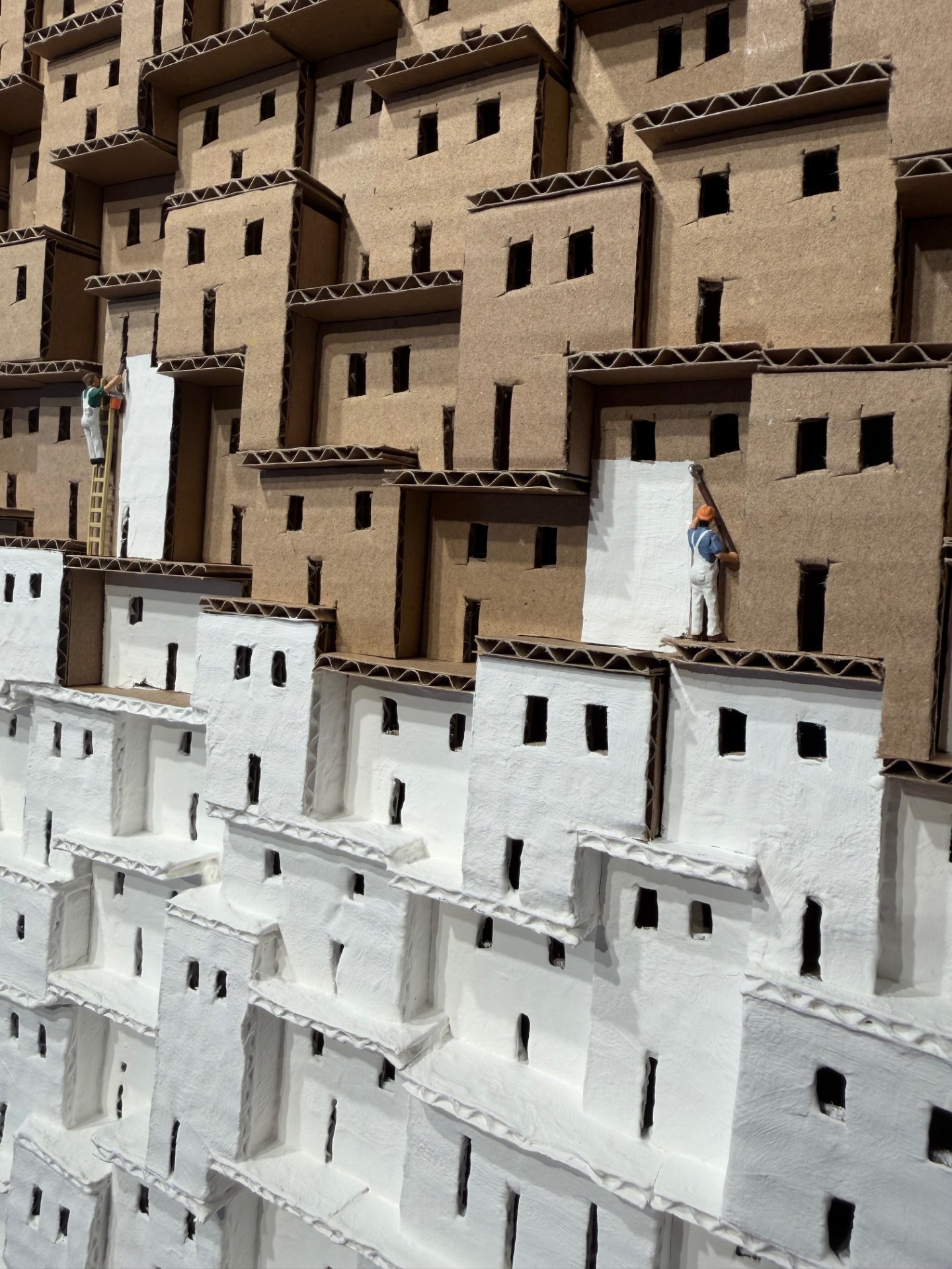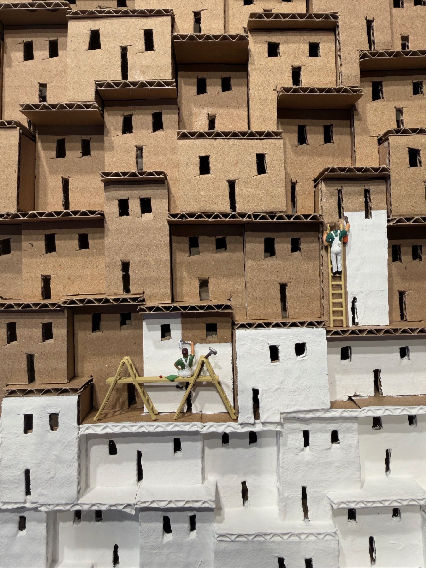 "Favelas Blanche avec peintres", techniques mixtes, pièce unique et signée par l’artiste. Format 64 cm x 84 cm.